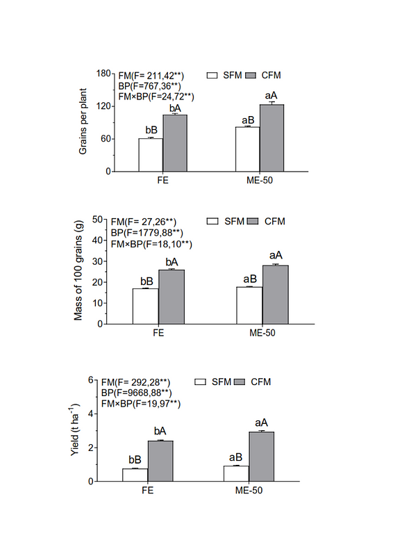 Supplementation with bioproducts (BP) can be an efficient alternative for the crop management, especially in those that are managed with low applications of mineral fertilizers. The objective of this study was to evaluate the complementary application of the bioproducts ME-50 and FitoMas-E (FE) in the increase of the common bean productivity. An experiment was carried out under field conditions with the common bean cultivar Bat-304. Treatments were distributed in a randomized block design, in a factorial scheme (2 × 2). Two levels of mineral fertilization (0 and 50 kg ha) and the application of the bioproducts ME-50 (100 mL L) and FE (2 L ha), with five repetitions were studied. At 40 days after the emergence, the average of trifoliate leaves per plant was determined and in the harvest the number of pods per plant, grains Alexander Calero-Hurtado, Yanery Pérez-Díaz, Yainier González-Pardo Hurtado, Dilier Olivera-Viciedo, Kolima Peña-Calzada, Iván Castro-Lizazo y Jorge F. Meléndrez-Rodríguez per plant, grains per pod, mass of 100 grains (g) and yield (kg ha) were evaluated. The results showed that application of the ME-50 and FE bioproducts increased the morphophysiological and productive parameters of the bean, with the consequent increase in yield in the presence of mineral fertilization. The results indicated that the ME-50 bioproduct was superior to the FE in both culture conditions. This study suggests that the use of both bioproducts constitutes an important contribution to the productive management of the species which improved the productive component and consequently the yield.