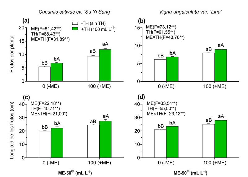 Inoculation between bacteria and fungi can be an efficient and viable alternative for production of horticultural crops. The purpose of this research was to evaluate the effects of co-inoculation between Trichoderma harzianum and the biostimulant ME-50® on the growth promotion and productivity of cucumber (Cucumis sativus L.) and green beans [Vigna unguiculata (L.) Walpen]. Two experiments under garden conditions were carried out, in a 2×2 factorial arrangement, in a random blocks with five replicates, to evaluate the effects of inoculation (100 mL L−1) and not inoculation to the soil with the bioestimulant ME-50® in combination with seed inoculation (100 mL L−1) and non-inoculation seeds with T. harzianum strain A-34 to improve the growth (height, leaf area and dry matter of leaves and stems) and productivity (number, length and mass of fruits and yield) of cucumber and green beans. Inoculation with the biostimulant ME-50® promoted greater growth and productivity of cucumber and green bean plants compared to the inoculation with T. harzianum. However, coinoculation between both biostimulants was more efficient in the growth and development of both plant species; increasing the productivity of cucumber (133 %) and green beans (138 %). The results of this study suggest that coinoculation between the biostimulant ME-50® and T. harzianum has a synergistic, efficient and viable effect on the growth and productivity of cucumber and green beans plants, being considered useful in organic, ecological and sustainable of the crops.